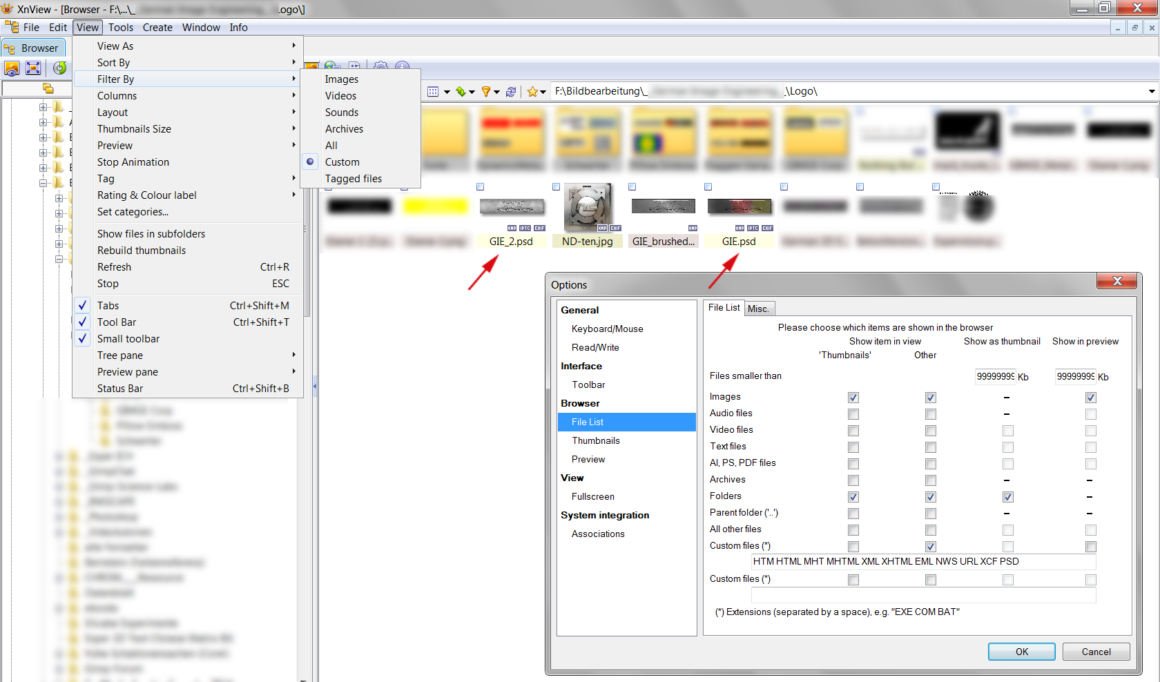 i tried to exclude psd files as well and although i restarted XnView, they are still visible.