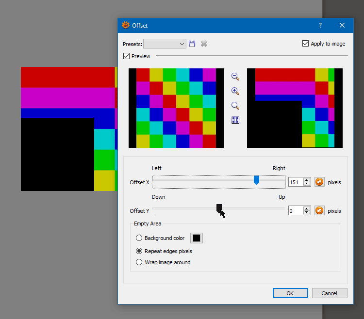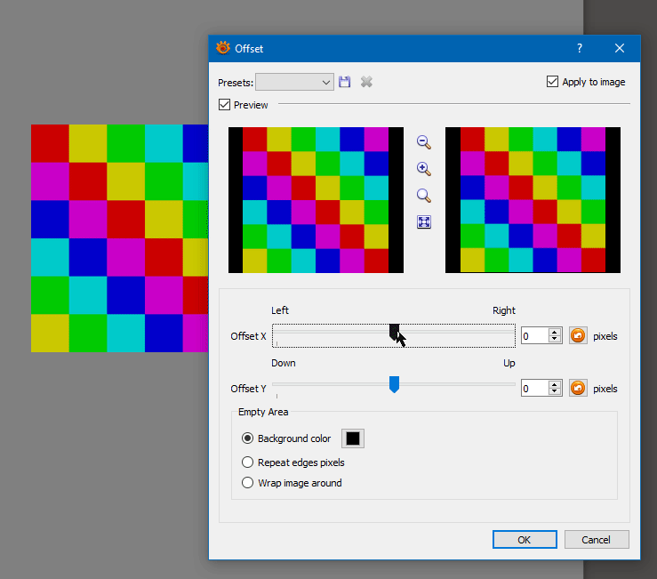 And there are no visible issues when offsetting in any of the four directions, when the "Empty area" is set to either "Background color" or "Wrap image around".
