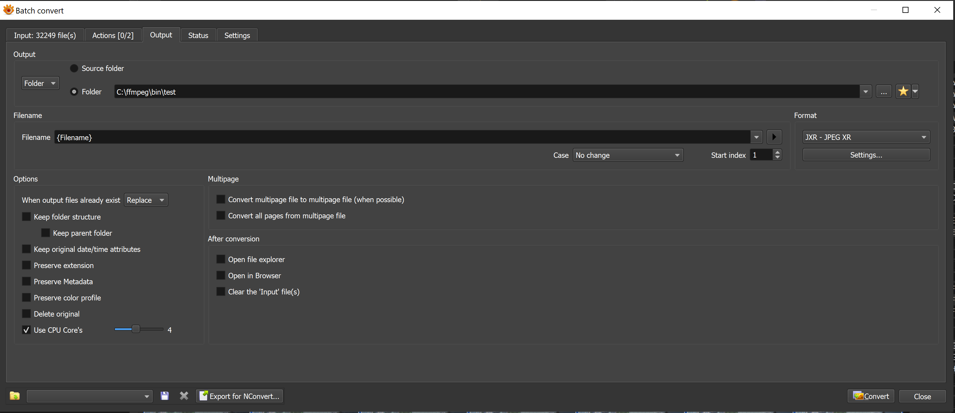 For input files, I am using TIFF (LZW compressed) images. For output I am using JPEG-XR. I have tried different output formats and still the same... if I don't tick "Use CPU Cores" then XnViewMP starts batch convert immediately.
