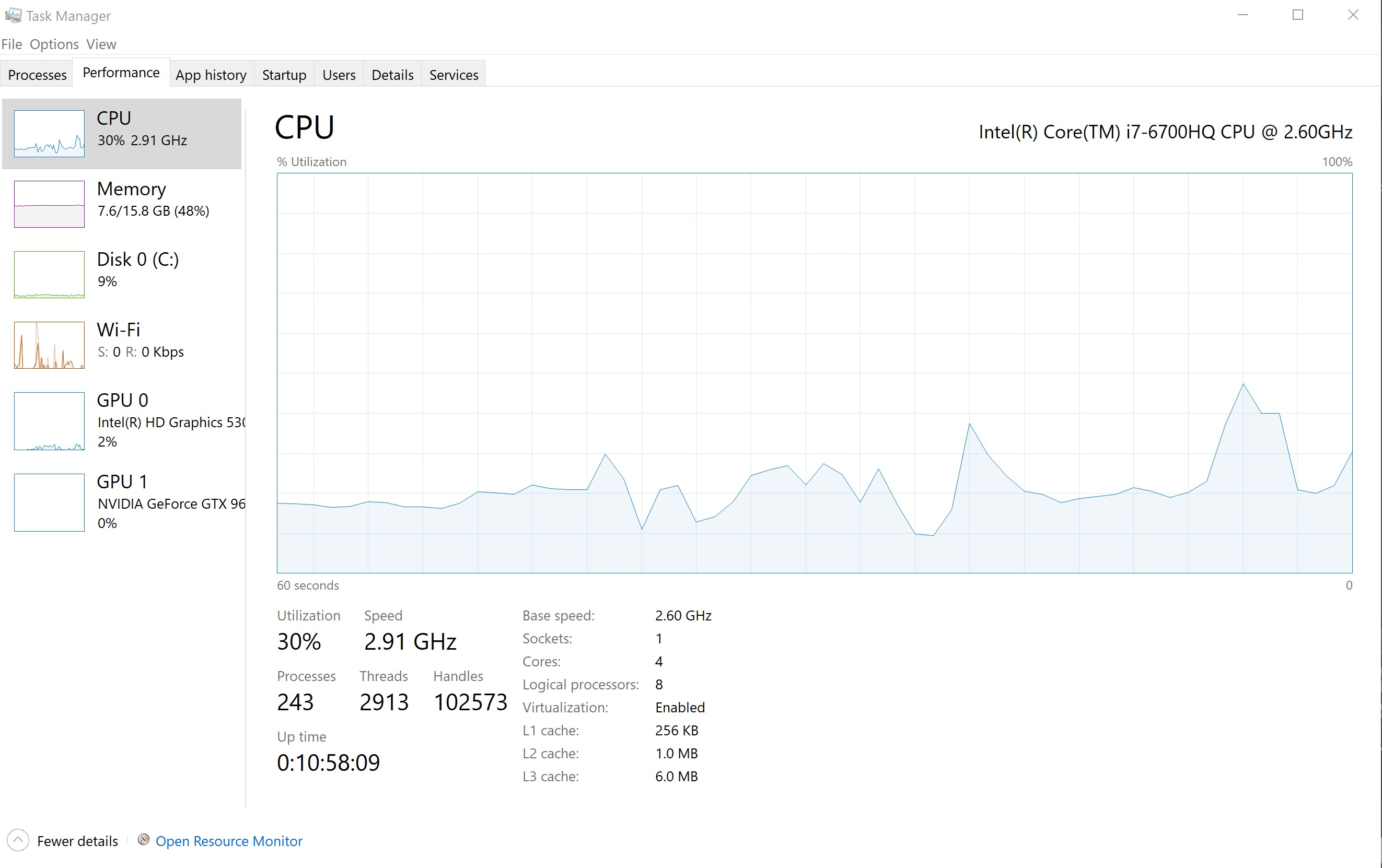 Computer: Dell XPS 9550 laptop (Intel i7-6700H @ 2.6 GHz, dual GPU - NVIDIA GTX 960M / Intel HD Graphics 530)