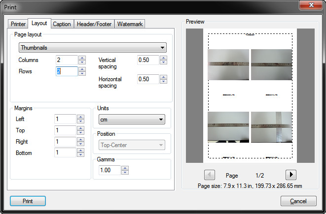 when printing multipe picture on one page with page layout 'Thumbnails', and captions on, there is a big gap between the picture and the caption.