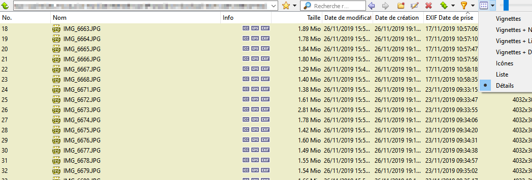 a) Afficher en mode détails pour voir les date de prise de vue