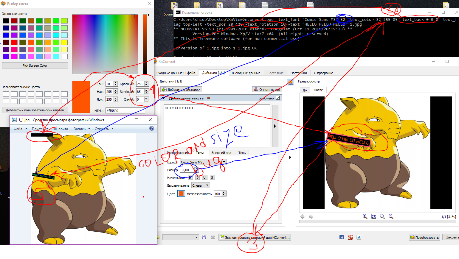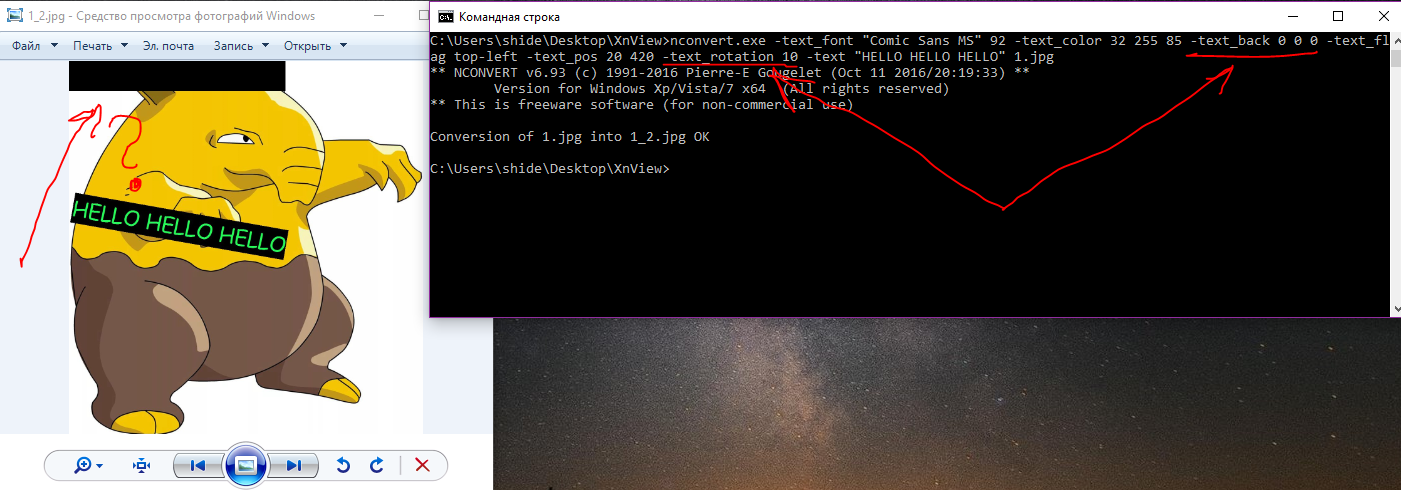 nconvert.exe -text_font "Comic Sans MS" 94 -text_color 255 85 0 -text_border 10 255 85 127 -text_back 0 0 0 -text_pos 90 280 -text_flag top-left -text_rotation 16 -text "HELLO HELLO HELLO" 1.jpg