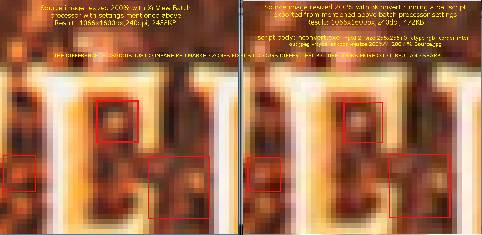 eli75 wrote:Unfortunately I noticed some unpleasent detail. NConvert scripts exported from XnView Batch Processor give me result very different from using Xnview Batch Proceesor itself with the same settings. Picture loses it's size and quality.