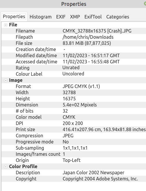Pierre?Wae666 wrote: Sat Feb 11, 2023 4:04 pm It seems to me that there is some limitation in the number of pixels for CMYK. About 2^29 px. But I don't know where to find information about it.