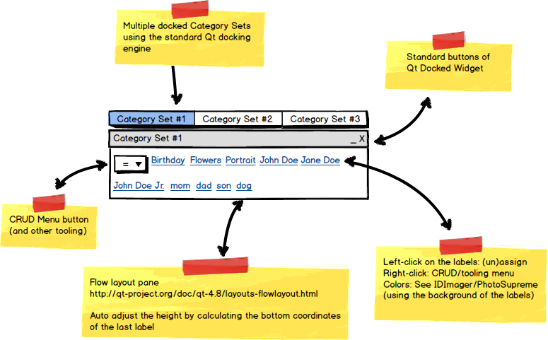 On the bottom of the form are several buttons to allow the management of the Sets (Add, Rename, Delete) and the items in the Sets (Add/Remove to/from Set). Beware, a category can be in 0, 1 or more Sets. For example "Portrait" can be in "Studio", "Weddings", "Sports" and in other sets. A button which isn't present in the draft above is "Assign Full Set" which will assign all the categories to the current selection of photos. From implementation POV it is a classical many-to-many relationship which can be modeled with few tables in the SQLite database.