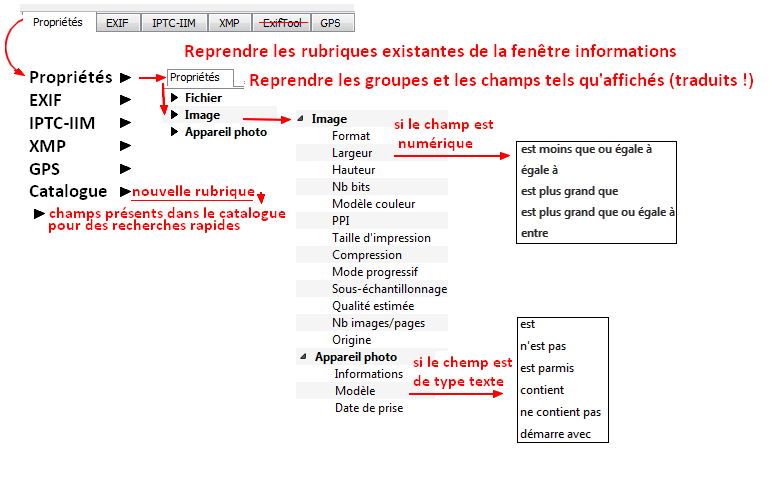 (nom de champ) (opérateur) (valeur) Exemple: (iptc caption) (contient) (camping)