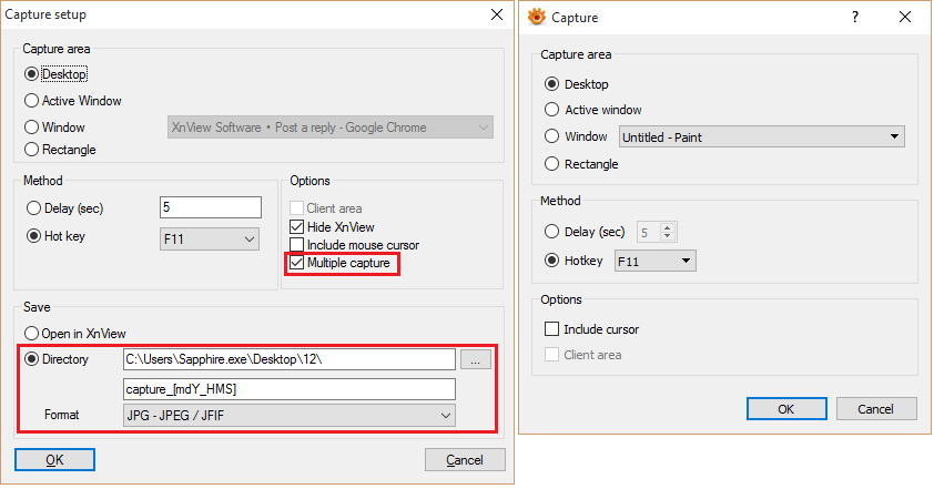I compared XnView with XnViewMP and found, that MP version has simplified interface of Screen Capture (Capture...). In XnViewMP that window missed two options - multiple capture and save to directory. Below I placed the screenshot with both the windows of screen capture. XnView at left, XnViewMP at right. I think, powerful and universal viewer as XnViewMP must have these two options.