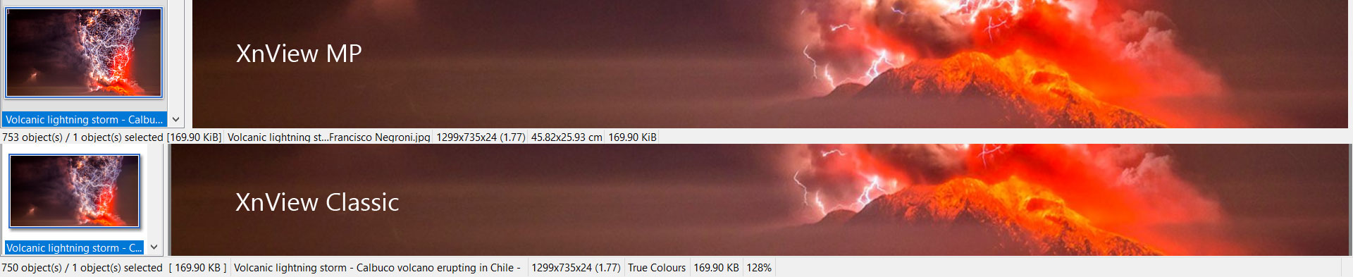 In this example, I can't read the filename because it doesn't fit on the thumbnail or the status bar. It also looks like XnView Classic made better use of the space; XnView MP wastes about 50% of the window width on blank space. I fixed it by adding maxCharsFilename=256 to the [Viewer] section of xnview.ini