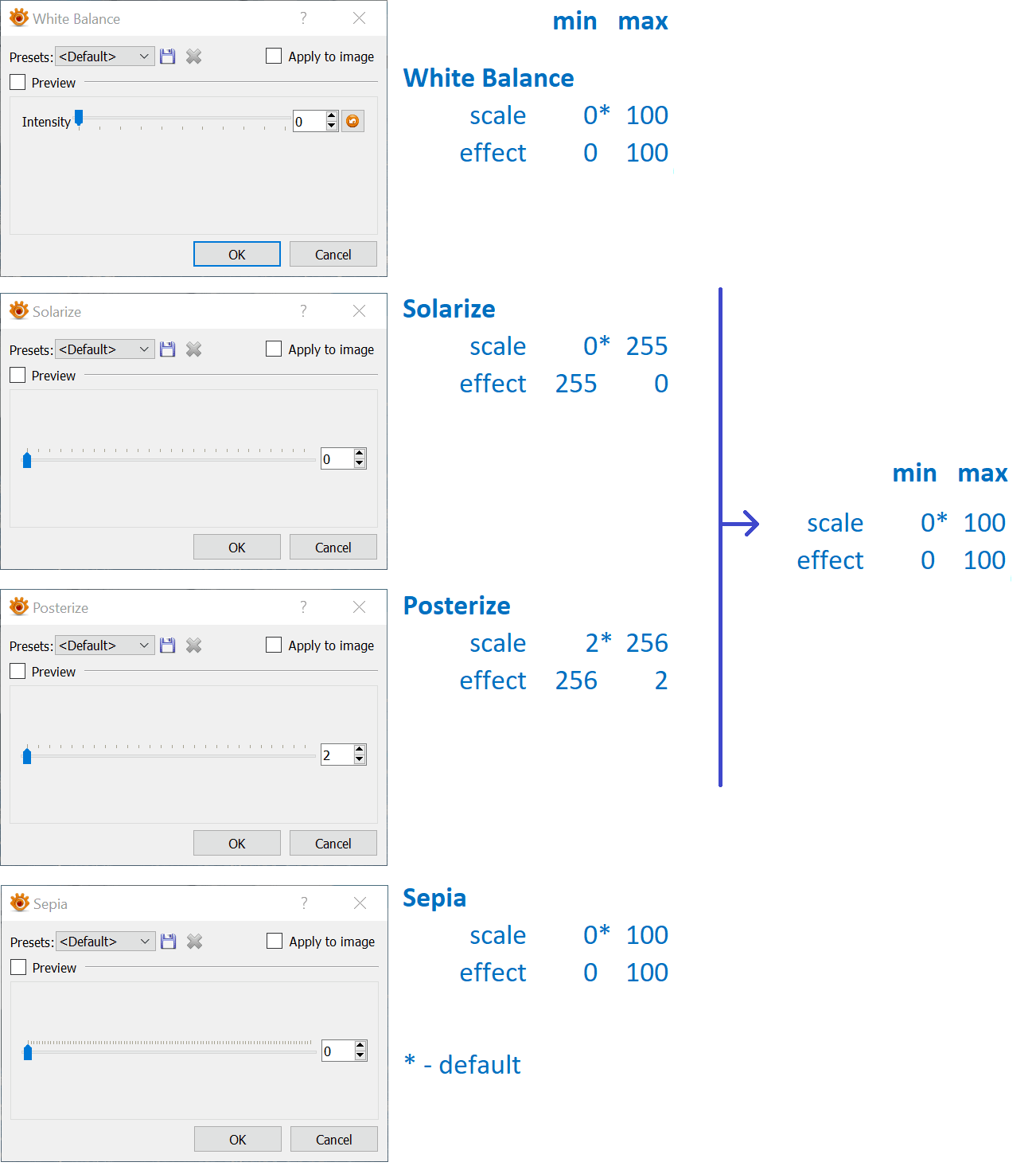 Unify UI/behaviour across multiple Map tools: White Balance, Solarize, Posterize and Sepia