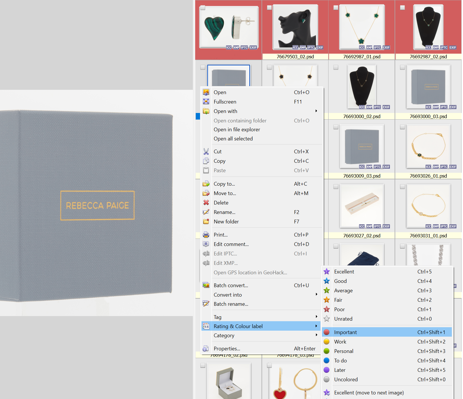 Currently background gets different color depending on what format it is (Color based on file format) which is great. Although if user labels an image "Red/Important", background doesn't change. an image only gets a tiny red dot to indicate that image was labeled. The small dot makes it really difficult to see which images where processed and which not. Similar with ratings. Changing Thumnbnail size doesn't change dot/rating color or size.
