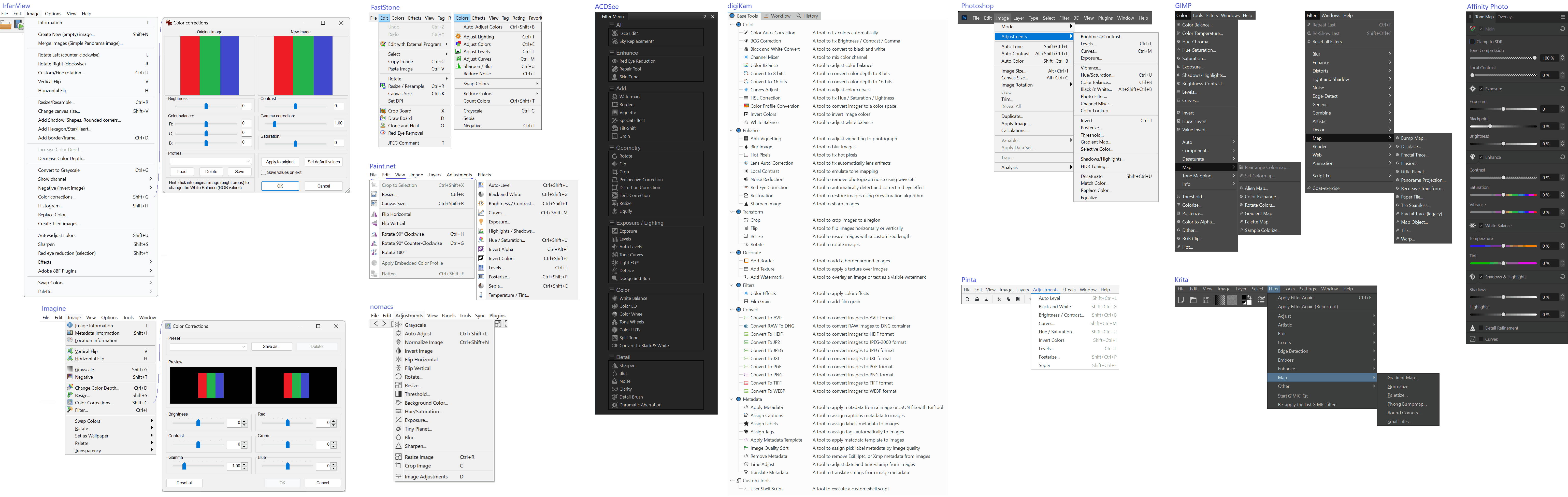 • FastStone, Imagine, Nomacs, IrfanView, ACDSee, digiKam, Photoshop, GIMP, Krita, Pinta, Affinity Photo, Paint.net