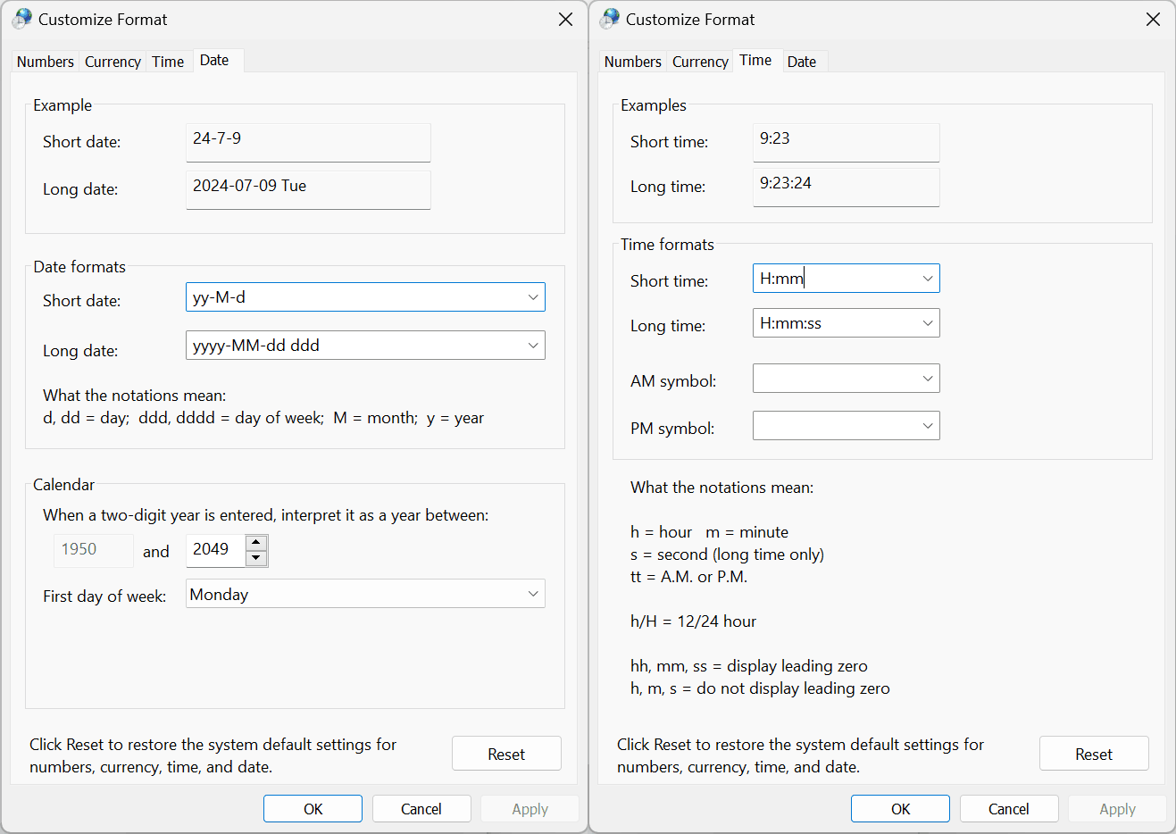 two different character notations are used for date/time variables: single-letter and ISO 8601 (correlation), which is inconvenient