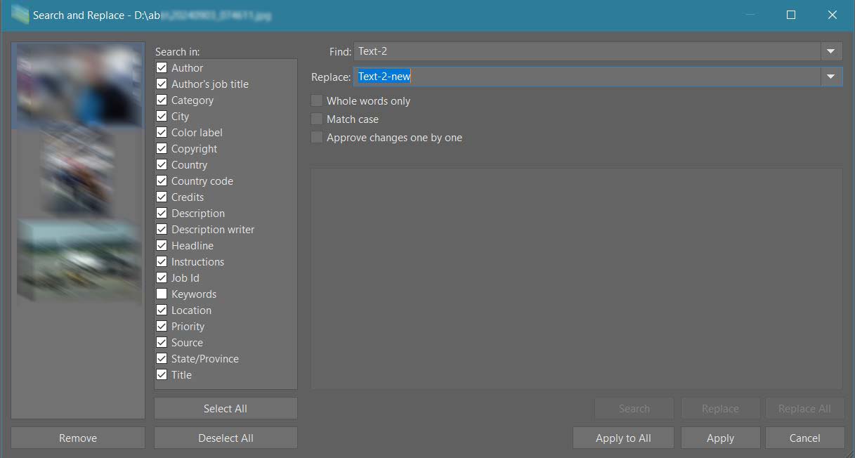 is there a function to search for a specific meta text in selected images and replace it with a new text?