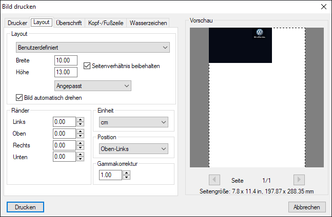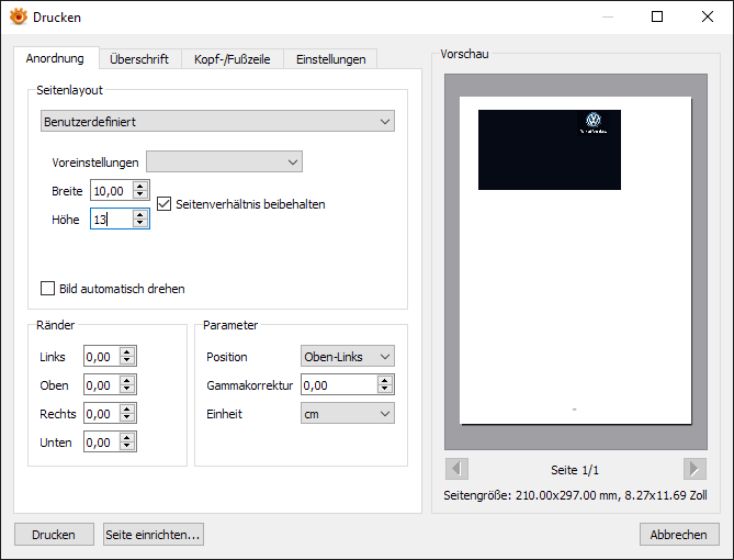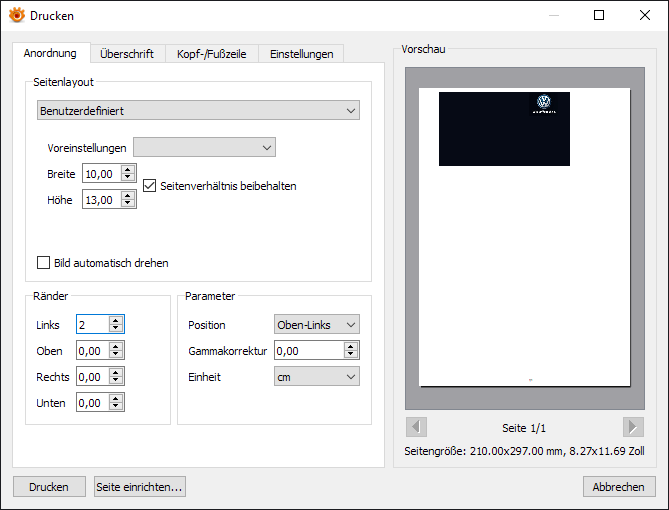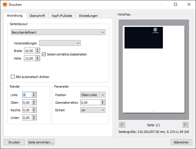 The Page Setup may also be replaced by the system/printer driver setting dialog that allows to define more precisely the printer features