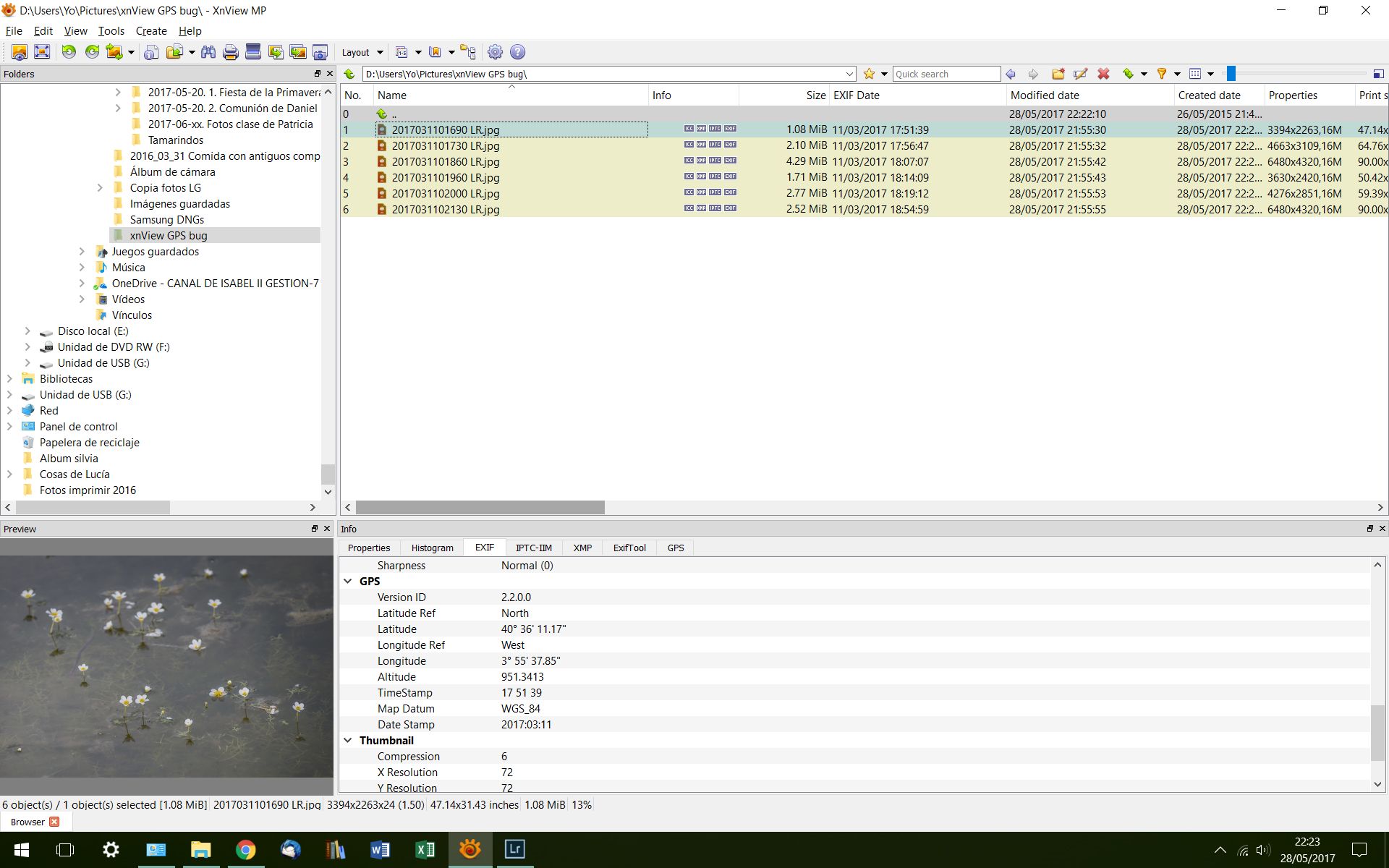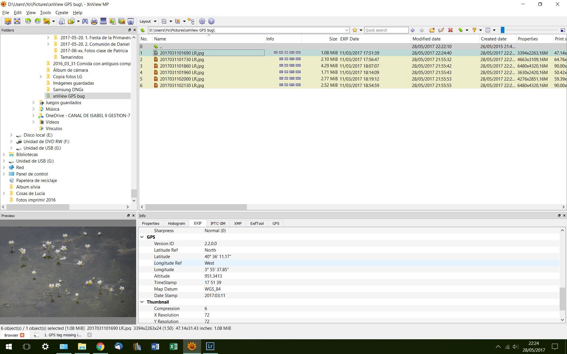 2. Now the weird part. All those images come from Adobe Ligthroom. If I re-export the jpg and I make a refresh in xnView (by pressing F5), GPS tag magically appears. Look at the second screenshot. You'll see that GPS tag is present and you can notice how this new file has an updated modified date. (But it is actually the very same jpg...).