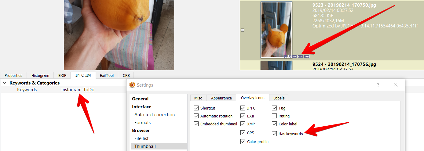 Settings->Thumbnail->Overlay Icons->Has keywords is checked, but thumbnails with keywords are not showing any overlay. Other overlays (i.e. automatic rotation, embedded thumbnail, etc) are shown - Has keywords seems to be the only one that's not working.