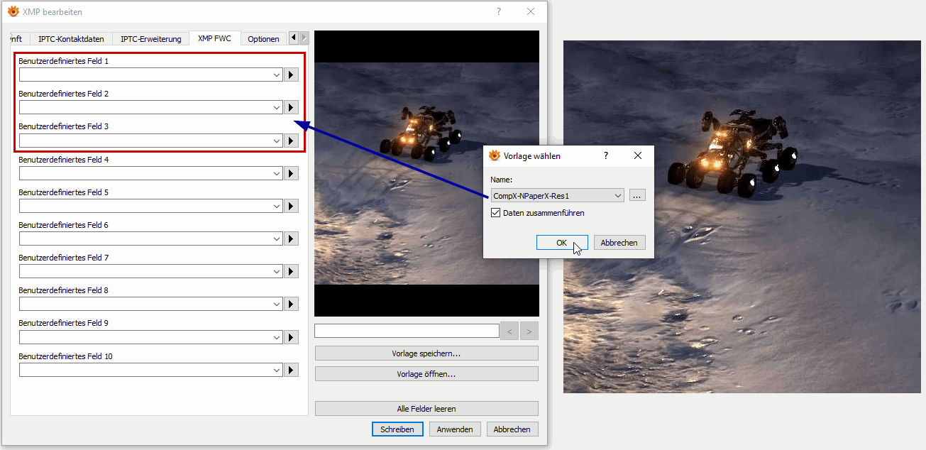 4. Open a different image now, got to Edit / Edit XMP / XMP FWC again and try to apply the same metadata..