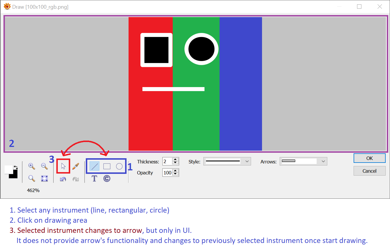 It does not provide arrow's functionality and changes to previously selected instrument once start drawing.