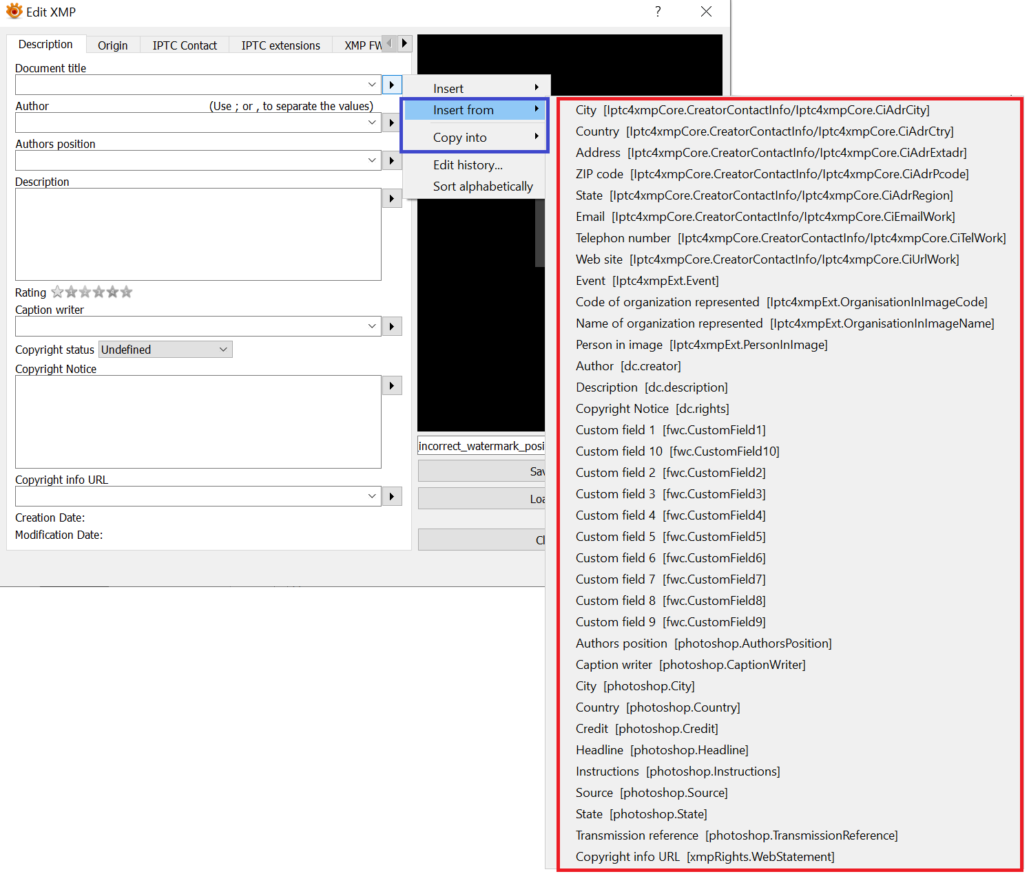 2. Items in 'Incert from' list shall be diabled if corresponding fields are empty (like in 'Edit IPTC' form)