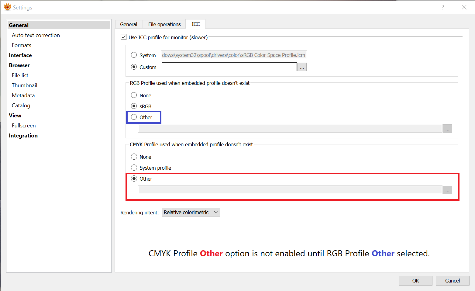 CMYK Profile Other option does not enable file selector until RGB Profile Other selected.
