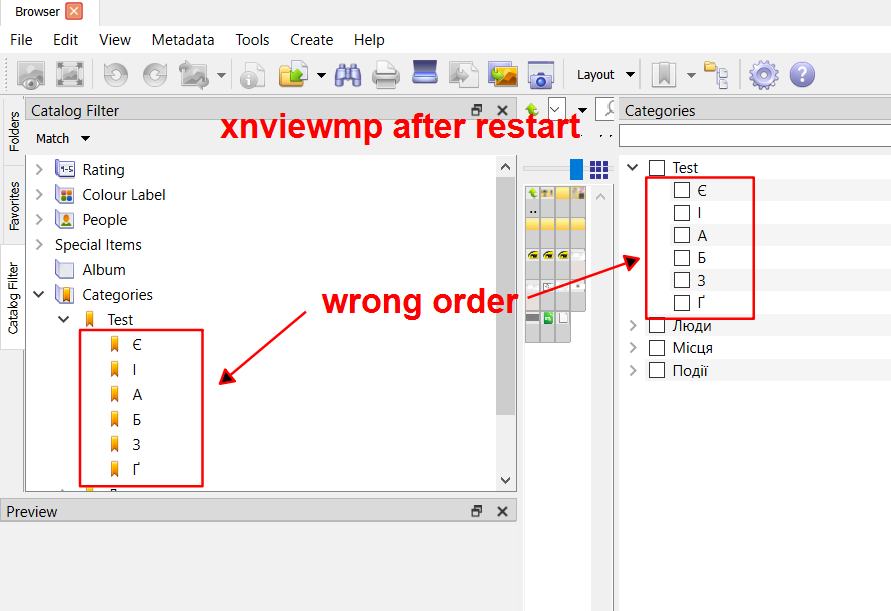 1. these are newly created categories and they are sorted incorrectly 2. these are the same categories after XnViewMP restart, the sorting is different from the first screenshot but is also wrong 3. this screenshot is made in XnView 2.51.7, i created the same categories, and here the order is correct