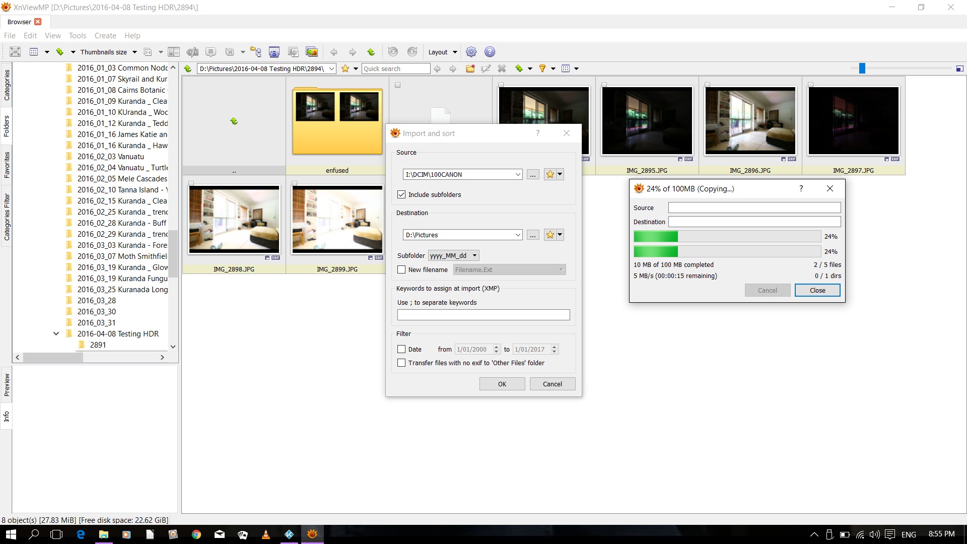 I imported them last time using windows (which I don't like as it gives them a different folder name to what I use - being YYYY_MM_DD)