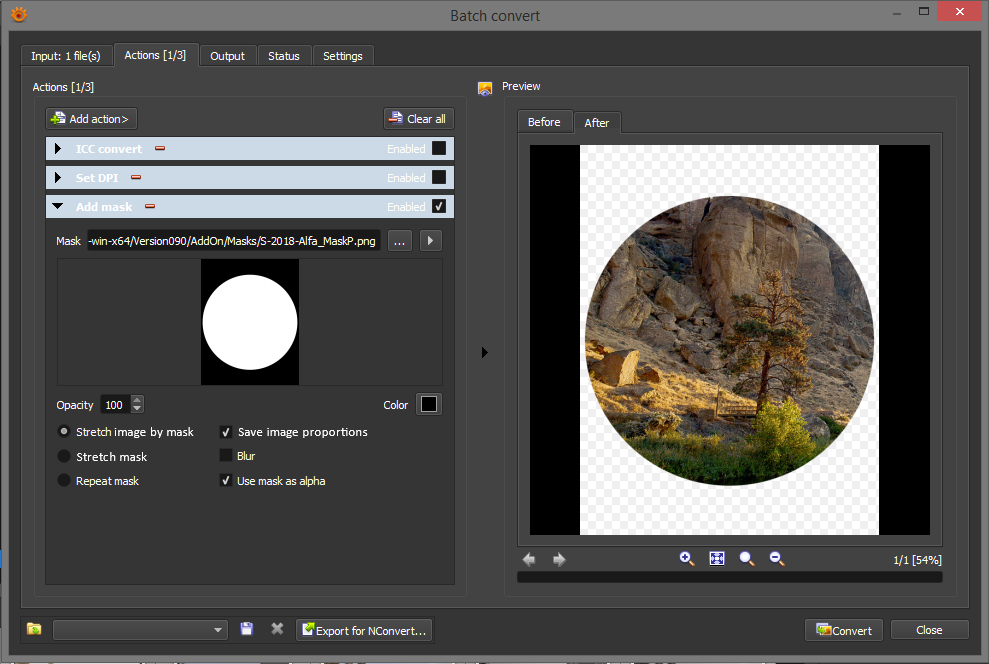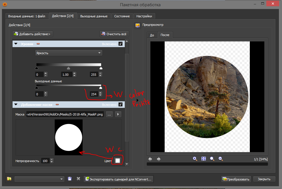 nconvert -icc_bcp -icc_intent 1 -icc_in "C:/WINDOWS/system32/spool/drivers/color/AdobeRGB1998.icc" -icc_out"C:/Windows/System32/spool/drivers/color/sRGB2014.icc" -dpi 300 [Levels input 255 to 254] -replace 0 0 0 1 1 1 [Mask to img, color W] -replace 255 255 255 0 0 0
