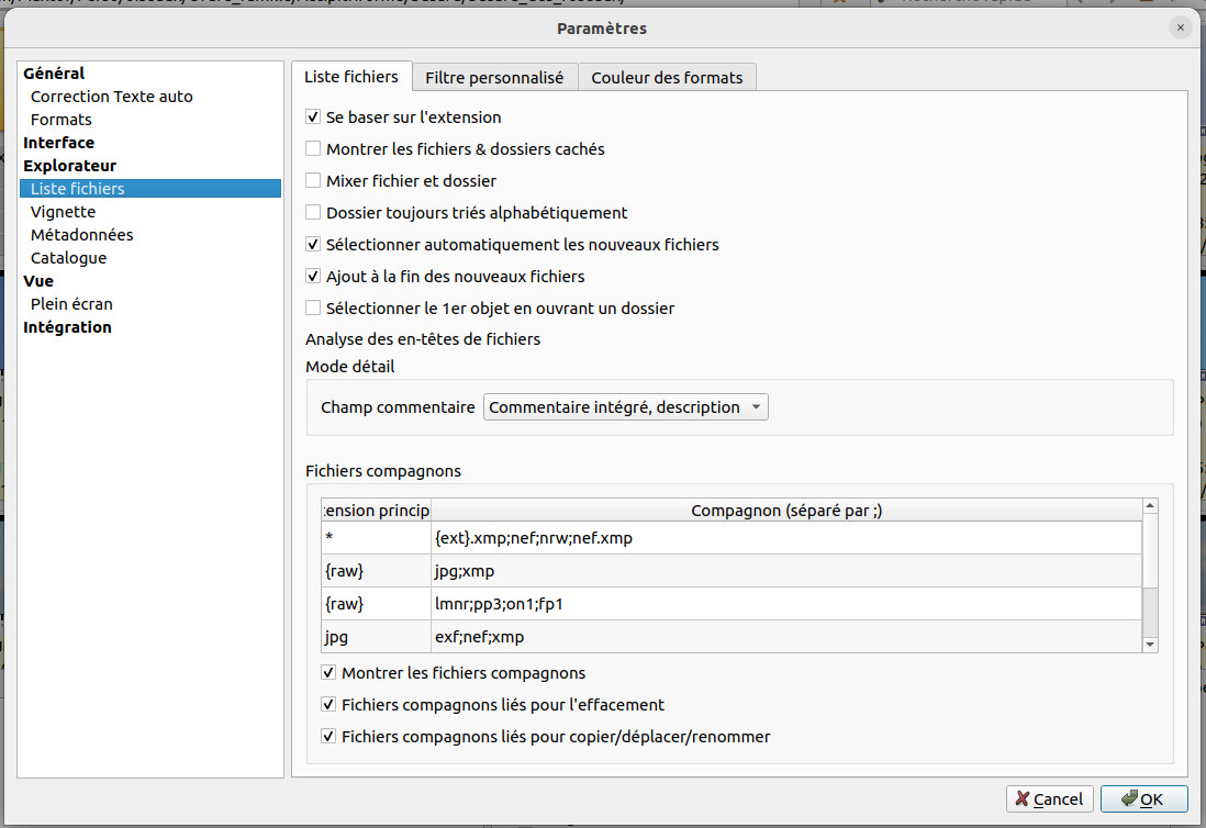 Je sélectionne l'ensemble des fichiers ciblés par l'outil Rechercher et je déplace les fichiers vers un autre dossier : tout se passe très bien sauf que chacun des fichiers jpg est accompagné de trois ou quatre fichiers compagnons (nef, nef.xmp, jpg.xmp (xmp générés par Darktable)) et que ces derniers ne sont pas déplacés. J'ai bien validé dans Paramètres Liste fichiers Fichiers compagnons (en mettant nef, xmp et même dans le doute jpg.xmp et nef.xmp) et j'ai coché en bas les trois propositions concernant les fichiers compagnons mais rien n'y fait.