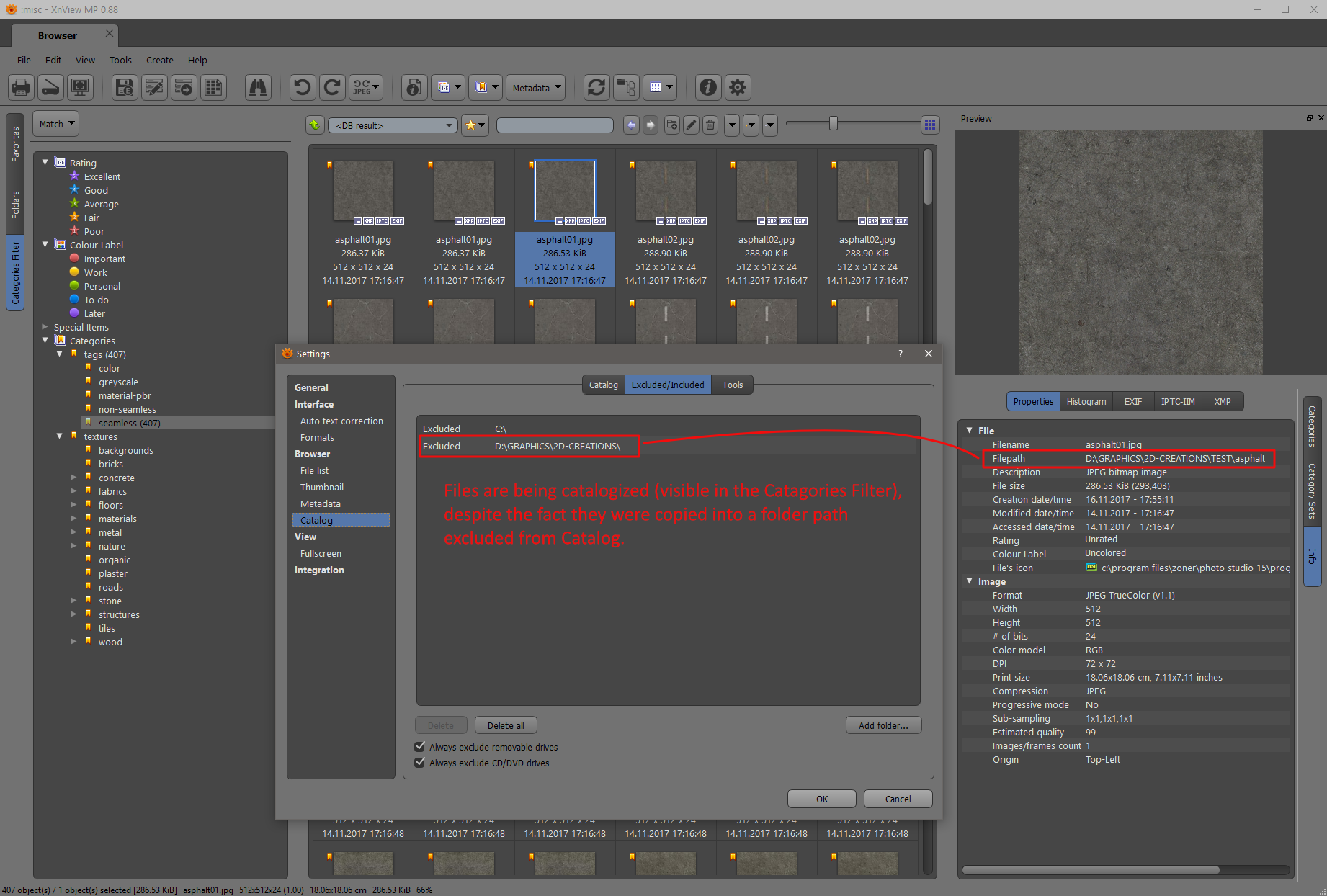 I have tried again and can still observe that. I took a screenshot. Files inside the excluded folders are still being catalogized. Even when I copy files into the excluded folders they are added to Catalog, which causes duplicate entries of the same file from folders supposed to be excluded from Catalog.xnview wrote:i can't reproduce, if i add a folder as exclude folder, it will not be in the catalog.