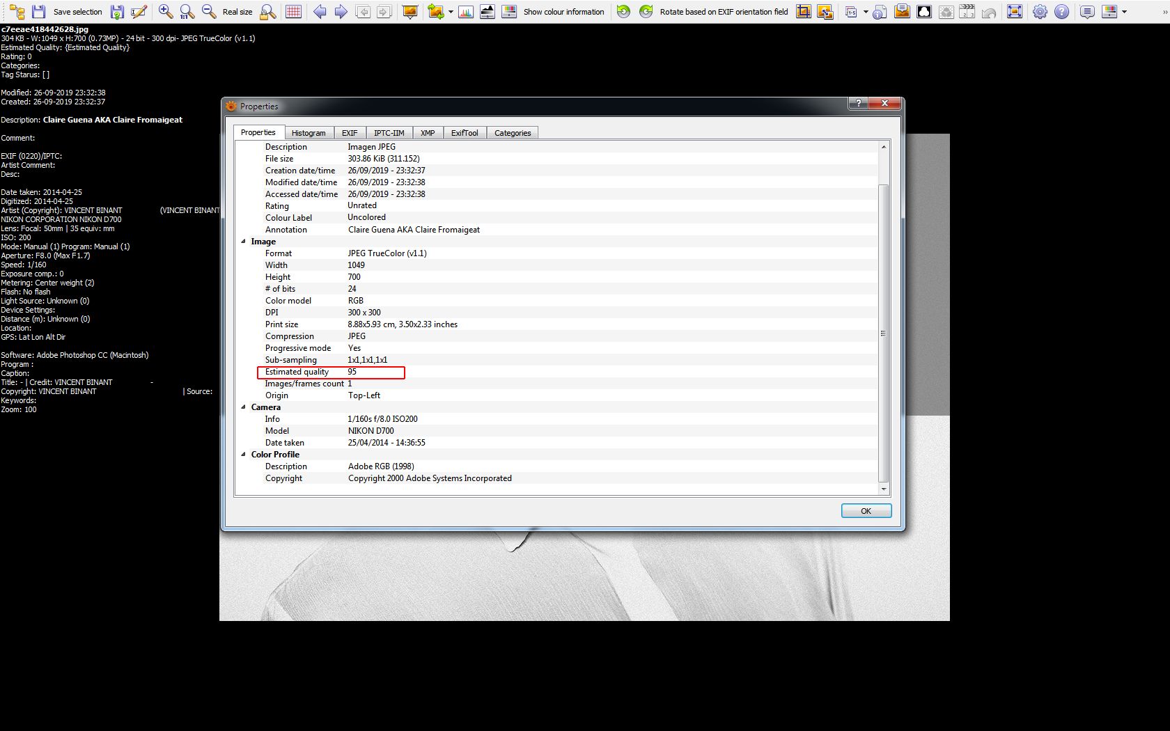 Estimated quality is present in the Properties pane.- Go to the next JPEG (PgDown).