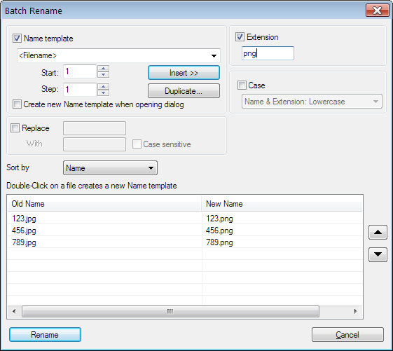 The XnView browser Tools > Rename... function can be used to change the extensions of a folder of images without altering the file names: