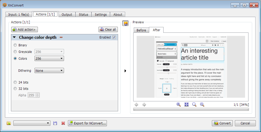 The equivalent in XnConvert is Image > Change color depth (which seems a better name...) and you can see that it is possible to reduce the colour depth in steps down to as few as 8 colours, if necessary, so you could experiment with lower values if you wish.
