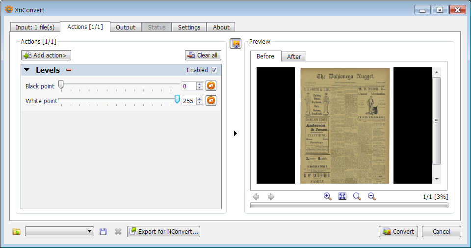 XnConvert currently doesn't have a deskew but XnView Classic does, XnConvert can increase contrast using the Levels function, smudges I would have to think about but I don't think they should really be an issue if you optimise your FineReader workflow. But FineReader provides a number of image enhancement tools including deskewing and contrast enhancement -- look for the 'Edit Image' icon on the toolbar. It is worth exploring the interface and reading the manual as OCR is a fairly heavyweight application.PorterSprings wrote:will xnconvert help with the deskew problem? Can xnconvert be used to "erase" the line between the newspaper columns? Can xnconvert be used to increase contrast? Also abbyy sees "smudges" on page and tries to convert them. Is there a way to bulk erase or diminish smudges? Maybe not.