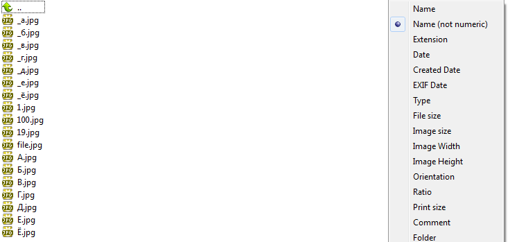 XnViewMP sorting acts weird not only with russian characters. Here is how one folder with pictures looks like in Windows: