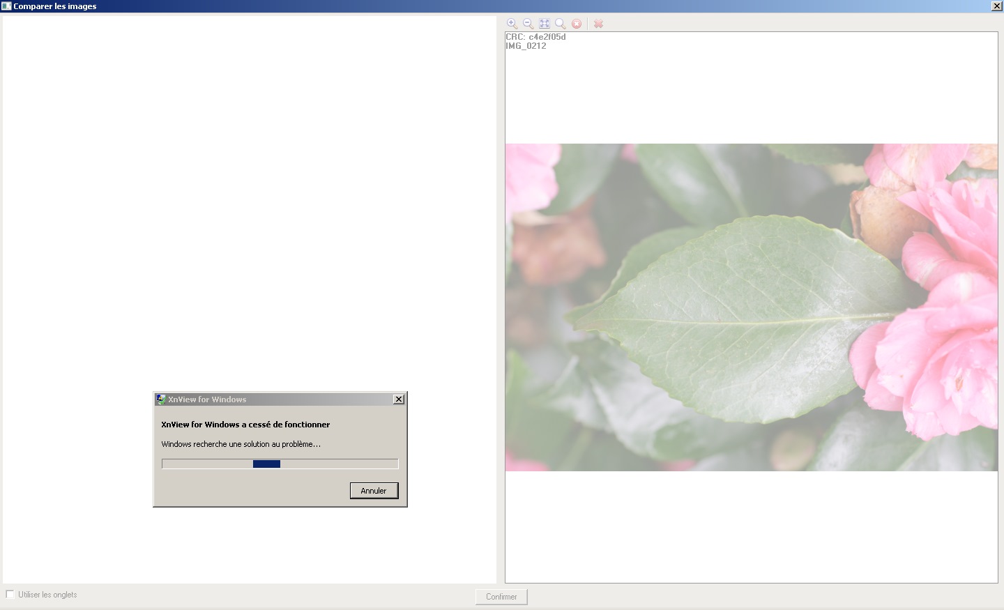 Lorsque je compare plusieurs images avec XNview 2.20 (sous windows 7), tout va bien jusqu'à ce que j'élimine la dernière. A ce moment là il ne me reste plus qu'une image à droite... et XNview crashe (même chose si je ne garde que celle de gauche).