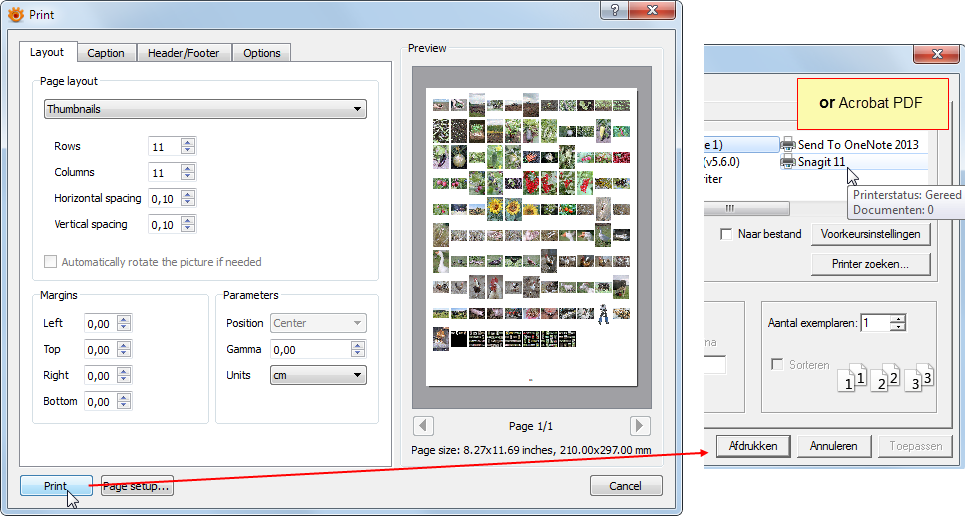 Having MP installed, I went on to select the thumbnails, then used File->Print, adjusted rows/colums (in the preview), etc->then selected SnagIt as printer, which was -admittedly- a wild guess.
