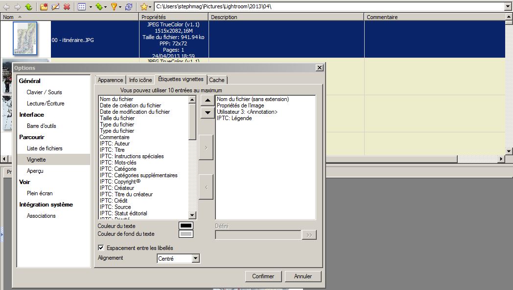 Par exemple, dans le mode "Vignettes & labels", j'ai paramétré l'affichage comme ceci :