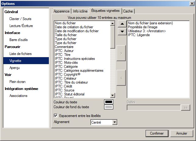 Options/Parcourir/Vignettes/Étiquettes vignettes comme indiqué