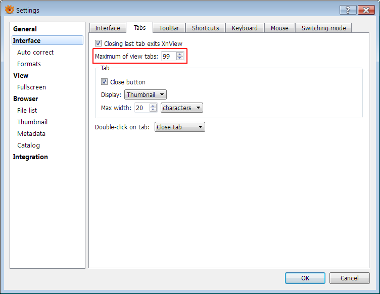 minsik wrote:When opening in Windows explorer an associated file ie jpg, it loads in xnview. when I press enter shows file explorer in xnview. thats nice. Now have 2 tabs showing an image and the browser. However when I then use the browser to open another different image there is another tab with the other opened file. Each time I press enter it goes back to the browser without closing the image tab. Eventually I have a large number of images open in tabs with the browser. Is there a way to restrict to a single tab and browser?