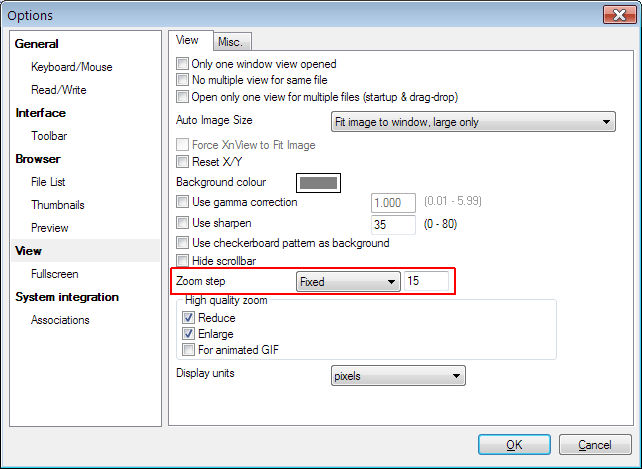 Tools > Options... > View -- View tab -- Zoom step select Default, Fixed or Relative and enter the desired value: