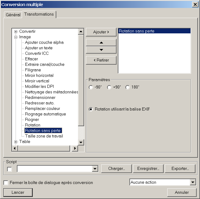 - Activez l'option Re-initialiser la balise orientation EXIF.