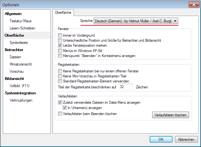 Werkzeuge > Optionen... > Oberfläche > Sprache
