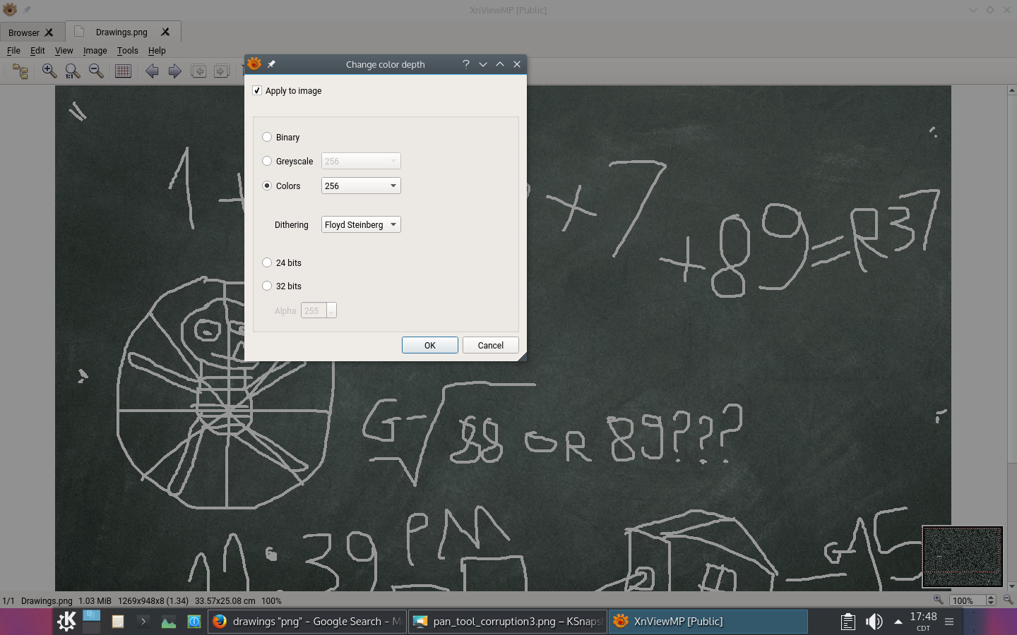 A corruption is seen on the Pan Tool when using the option "Change Color Depth". It happens when you select the 8 bit option and any of the filters on the option box. I have checked against several type of images and it happens on all of them (png, gif, jpeg). This however, doesn't seem to corrupt any file when I save them.