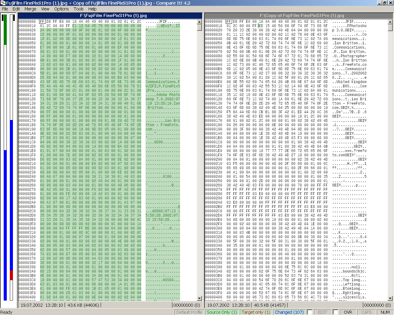 I used FujiFilm FinePixS1Pro (1).jpg and CompareIt! (Find moved sections & Align mode activated) for my tests.