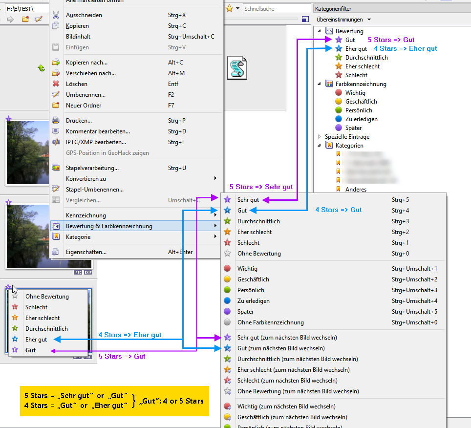 - Main menu "Ansicht" -> "Bewertung und Farbkennzeichnung" (5* = Sehr gut / 4* = Gut)