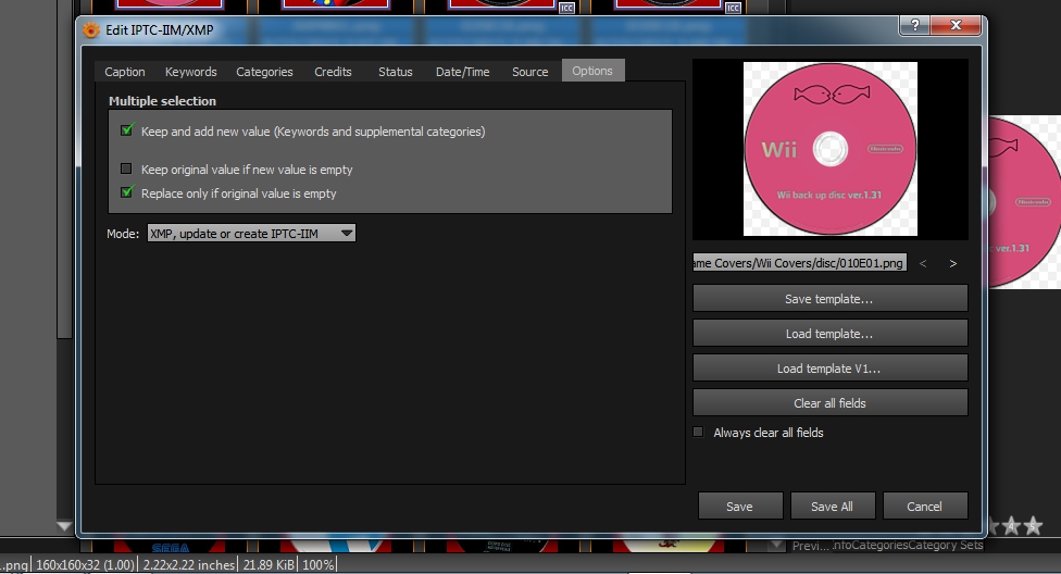Options page of Edit dialoge for IPTC/XMP