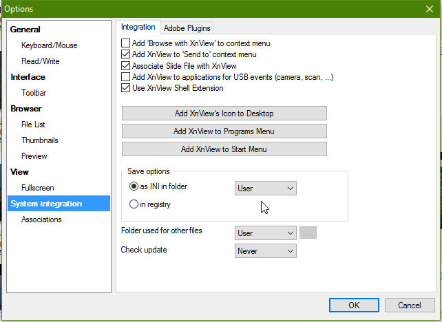 Under "Tools->Options-> System integration" "Save options" is marked as INI in folder User. When I edit the INI file manually then these settings will be load next time I start XnView but changes are not stored in this INI file.