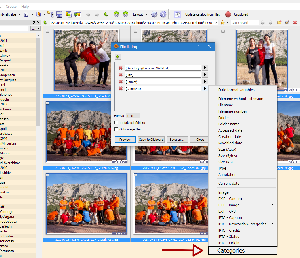 On the other hand, something simpler - and also good - would be the following:If you are referring to Browser -> Metadata -> "Export DB Category to XMP Subject and IPTC Keyword" -> "Create IPTC Data", I agree, it should.When forcing XnView to store the categories as IPTC data in the image, you can use the field "{IPTC:Keywords}" to export the categories in the file list.