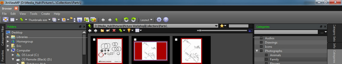 Restarting XnView OR closing and reopening the browser tab fixes all of this, but maximizing/restoring, minimizing/restoring, covering it up with another window, scrolling the affected pane, switching to a viewer tab and back, and restoring the layout again do not. Switching to a different layout then restoring my saved layout didn't work on the first try, but then I switched around between a few different ones followed by another restore of mine and then it was fixed. The line also is not visible in other tabs, so it's an artifact of the browser, not the XnView GUI as a whole.